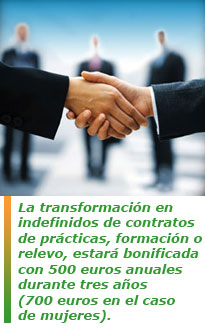 ➔ La transformación en indefinidos de contratos de prácticas, formación o relevo, estará bonificada con 500 euros anuales durante tres años (700 euros en el caso de mujeres).