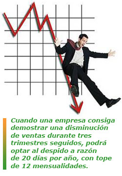 Se han clarificado y ampliado las causas por las que una empresa puede acogerse a esta modalidad de despido (que recordemos se indemniza a razón de 20 días por año de antigüedad con un tope de 12 mensualidades de sueldo). Así, la nueva redacción dice literalmente: "Se entiende que concurren causas económicas cuando de los resultados de la empresa se desprenda una situación económica negativa, en casos tales como la existencia de pérdidas actuales o previstas, o la disminución persistente de su nivel de ingresos o ventas. En todo caso, se entenderá que la disminución es persistente si se produce durante tres trimestres consecutivos".
