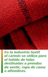 El carmín es usado tanto para la industria farmacéutica como la textil, la alimentaria o la cosmética. La industria alimenticia ocupa más o menos un 75% del consumo de este colorante, seguido de la industria cosmética (15%) y por último la farmacéutica y textil (10%).