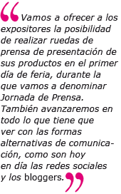 M.P.: Una de ellas será ofrecer a los expositores la posibilidad de realizar ruedas de prensa de presentación de sus productos en el primer día de feria, durante la que vamos a denominar Jornada de Prensa. También avanzaremos en todo lo que tiene que ver con las formas alternativas de comunicación, como son hoy en día las redes sociales y los bloggers.