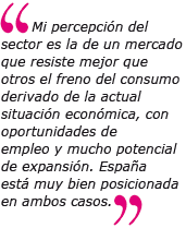 M.P.: Mi percepción del sector es la de un mercado que resiste mejor que otros el freno del consumo derivado de la actual situación económica, con oportunidades de empleo y mucho potencial de expansión. España está muy bien posicionada en ambos casos.