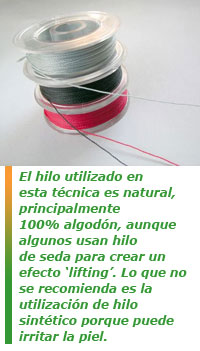 Aunque se pudiera pensar que el hilo utilizado para esta técnica debería ser especial y fabricado para esta función, lo cierto es que se trata de un hilo natural, principalmente 100% algodón, aunque algunos usan hilo de seda para crear un efecto lifting. Lo que no se recomienda es la utilización de hilo sintético porque puede irritar la piel.