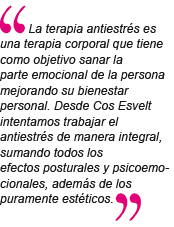 C.E.: Es una terapia corporal que tiene como objetivo sanar la parte emocional de la persona mejorando su bienestar personal. Desde nuestro centro Cos Esvelt intentamos trabajar el antiestrés de manera integral, sumando todos los efectos posturales y psicoemocionales, además de los puramente estéticos.