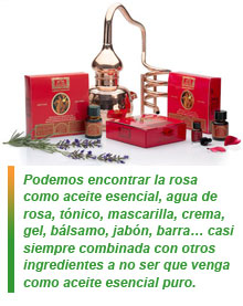 Podemos encontrar la rosa como aceite esencial, agua de rosa, tónico, mascarilla, crema, gel, bálsamo, jabón, barra… casi siempre combinada con otros ingredientes a no ser que venga como aceite esencial puro.