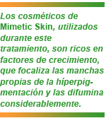 Los factores de crecimiento son unas proteínas clave en el proceso de regeneración natural de los tejidos que se encuentran en las plaquetas. Su función principal es enviar señales a las células para que éstas comiencen a generar tejido nuevo cuando se encuentra lesionado o dañado. Los cosméticos de Mimetic Skin, utilizados durante este tratamiento, son ricos en esta sustancia que focaliza las manchas propias de la híperpigmentación y las difumina considerablemente.