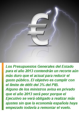 ➔ Los Presupuestos Generales del Estado para el año 2013 contendrán un recorte aún más duro que el actual para reducir el gasto público. El objetivo es cumplir con el límite de défit del 3% del PIB. Alguno de los ministros avisa en privado que el año 2013 será peor porque el Ejecutivo se verá obligado a realizar más ajustes sin que la economía española haya empezado todavía a remontar el vuelo.