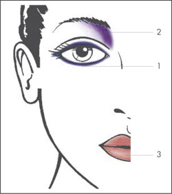 Para que el maquillaje de los ojos sea más duradero e intensivo, bordear primero el ojo con Automatic Pencil for Eyes K16 Blue Violet (1), dibujando el ángulo superior exterior en forma de almendra. Aplicar abundante cantidad de la sombra de ojos Magic Shadow 33 Violet (2) en forma de media luna, desde el interior del párpado superior hasta el comienzo de la ceja. Para más suavidad en este look, repasar con poca cantidad de la sombra de ojos violeta, la línea del párpado. Atenuar con Magic Shadow 23 Highlight el párpado móvil y "la banana" hasta justo debajo de la ceja (¡pero mantenerse por debajo del violeta!).