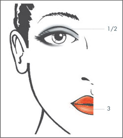 Bordear de forma suave y con un pincel de sombras de ojos oblicuo el párpado superior e inferior, aplicando el color azul hielo Magic Shadow 32 Ice Blue (1), hasta llegar al ángulo interior del ojo. Para "abrir la mirada", aplique bastante cantidad del color blanco plateado de Pencil for Eyes Diamond Silk (2) en el ángulo interior del ojo. Aplique sobre el párpado móvil el color plateado de Magic Shadow Trio Diamonds & Pearls, o si lo prefiere, Magic Shadow 23 Highlight. Atenuar la sombra de ojos plateada con un pincel o con los dedos, hasta llegar a las cejas.