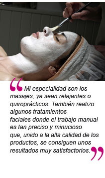 N.G.: Los masajes, ya sean relajantes o quiroprácticos. También realizo algunos tratamientos faciales donde el trabajo manual es tan preciso y minucioso que, unido a la alta calidad de los productos, se consiguen unos resultados muy satisfactorios. En definitiva, todos los tratamientos manuales ya que, sin menospreciar la aparatología, es donde me encuentro en íntima conexión con mis clientes.