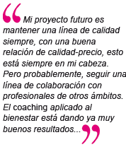 N.G.: Mantener una línea de calidad siempre, con una buena relación de calidad-precio, esto está siempre en mi cabeza. Pero probablemente, seguir una línea de colaboración con profesionales de otros ámbitos. El coaching aplicado al bienestar está dando ya muy buenos resultados. También nos estamos introduciéndonos en el mundo de las redes sociales y web 2.0, lo cual te brinda una oportunidad única de conocer a tus clientes, escucharles y saber qué quieren.