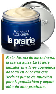 Sin embargo, ha sido en épocas recientes donde se ha empezado a utilizar el caviar como ingrediente cosmético. Una de las pioneras fue la química alemana Ingrid Millet, que investigó los beneficios cosméticos del caviar en el rejuvenecimiento de la piel. Más tarde, la marca suiza La Prairie lanzaba en la década de los ochenta una línea cosmética basada en el caviar que sería el punto de inflexión para la popularidad y expansión de este producto.