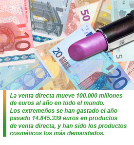 Los extremeños se han gastado el año pasado 14.845.339 euros en productos de venta directa, y han sido los productos cosméticos los más demandados. Las empresas de venta directa han facturado en esta comunidad un 3 por ciento del total nacional, según ha informado la Asociación de Empresas de Venta Directa (AVD).