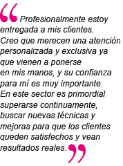 G.C.: Entregada a mis clientes. Creo que merecen una atención personalizada y exclusiva ya que vienen a ponerse en mis manos, y su confianza para mí es muy importante. Atenta, porque creo que las expectativas de cada cliente son diferentes y entender sus necesidades es clave. Y constante afán de superación. En este sector es primordial superarse continuamente, buscar nuevas técnicas y mejoras para que los clientes queden satisfechos y vean resultados reales.