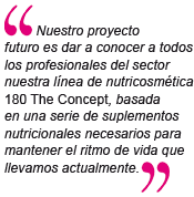 G.C.: Dar a conocer a todos los profesionales del sector nuestra línea de nutricosmética, 180 The Concept, basada en una serie de suplementos nutricionales necesarios para mantener el ritmo de vida que llevamos actualmente. Con las tres líneas: Essencials, Revitalising y Healing logramos cubrir una serie de carencias muy relevantes para nuestros clientes, obteniendo resultados probados y comparables.