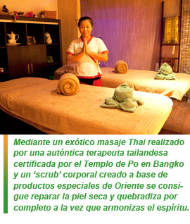 3) El último paso consiste en un masaje Thai de estiramiento y flexibilidad en el que se trabajan todos los músculos del cuerpo, incluyendo rostro y cuero cabelludo. La terapeuta tailandesa utiliza para este masaje una combinación de aceites esenciales y productos provenientes de Oriente, como caña de azúcar, coco, café tailandés o piña.