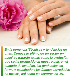 Peony de Sy, fundadora de los salones The Pink Peony y experta en estética formada en Nueva York, con más de 15 años de experiencia en los sectores de la moda y la belleza, ofrecerá la ponencia Técnicas y tendencias de uñas. Conoce lo último de un sector en auge en el Congreso de Estética de Cosmobelleza 2013. En ella se tratarán temas como la evolución que se ha producido en nuestro país en el cuidado de las uñas, las tendencias en forma y esmaltado y las últimas novedades en nail art, así como las texturas en 3D. Además, se darán recomendaciones para retrasar el envejecimiento de las manos.