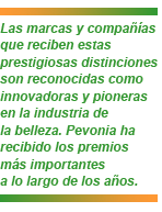 Pevonia ha recibido los premios más importantes a lo largo de los años. Este año que acaba de terminar, sin embargo, es particularmente memorable para Pevonia dado que se diferencia de la competencia recibiendo 19 de los premios de belleza más importantes.