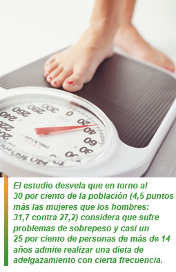 También es cada vez más común para los españoles realizar algún tipo de dieta, de forma más o menos frecuente. De hecho, en torno al 30 por ciento de la población (4,5 puntos más las mujeres que los hombres: 31,7 contra 27,2) considera que sufre problemas de sobrepeso y casi un 25 por ciento de personas de más de 14 años admite realizar una dieta de adelgazamiento con cierta frecuencia. Una práctica que un 16 por ciento de los hombres realiza "a veces" o "a menudo", mientras que entre las mujeres supera el 30 por ciento, presentando además una tendencia creciente.