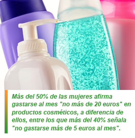 El estudio revela también significativas diferencias entre el comportamiento de hombres y mujeres, tanto en su actitud respecto al cuidado por su propia imagen como en las conductas de compra que realizan en su vida cotidiana. En este sentido, aunque los españoles manifiestan su preocupación por su aspecto, el gasto mensual en cosméticos es más alto en mujeres que en hombres. Más del 50% de ellas afirma gastarse al mes "no más de 20 euros" en productos cosméticos, a diferencia de ellos, entre los que más del 40% señala "no gastarse más de 5 euros al mes". Sin embargo, sea por la crisis económica actual o por cambios en las tendencias de moda, parece que las mujeres invierten menos en productos de maquillaje, ya que según el estudio el consumo de algunos productos ha descendido alrededor de un 10% en los últimos años (barras de labios y colorete).