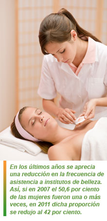 La investigación ha mostrado que alrededor del 25 por ciento de las mujeres han visitado un instituto de belleza o estética en el último año. Si bien este valor es estable en los últimos años, se aprecia una reducción en la frecuencia de asistencia a este tipo de centros. Así, si en 2007 el 50,6 por ciento de las mujeres fueron una o más veces, en 2011 dicha proporción se redujo al 42 por ciento.