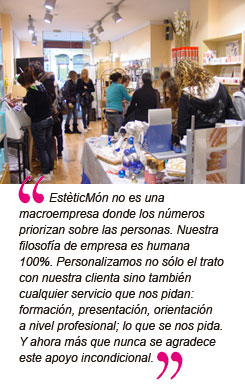 M.P.: En que somos una empresa que ofrece una atención "a medida". EstèticMón no es una macroempresa donde los números priorizan sobre las personas. Nuestra filosofía de empresa es humana 100%. Personalizamos no sólo el trato con nuestra clienta sino también cualquier servicio que nos pidan: formación, presentación, orientación a nivel profesional; lo que se nos pida. Y ahora más que nunca se agradece este apoyo incondicional.