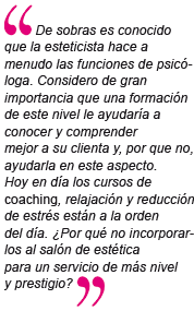 M.P.: La imaginación es libre y a mí me gusta mucho pensar que estamos en constante evolución. Soy amante de la psicología y todo lo relacionado con la comunicación y las relaciones humanas. De sobras es conocido que la esteticista hace a menudo las funciones de psicóloga. Considero de gran importancia que una formación de este nivel le ayudaría a conocer y comprender mejor a su clienta y, por que no, ayudarla en este aspecto. Hoy en día los cursos de coaching, relajación y reducción de estrés están a la orden del día. ¿Por qué no incorporarlos al salón de estética para un servicio de más nivel y prestigio?