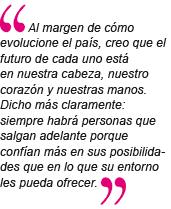 M.P.: Al margen de cómo evolucione el país, creo que el futuro de cada uno está en nuestra cabeza, nuestro corazón y nuestras manos. Dicho más claramente: siempre habrá personas que salgan adelante porque confían más en sus posibilidades que en lo que su entorno les pueda ofrecer. Y por esto, porque he conocido a estas personas, tengo la certeza de que en el futuro seguiremos creciendo, no sin dificultades, no sin riesgos, pero con la preparación y precaución necesarias para solventarlas.