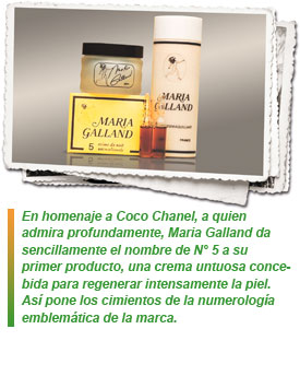 En homenaje a Coco Chanel, a quien admira profundamente, Maria Galland da sencillamente el nombre de N° 5 a su primer producto, una crema untuosa concebida para regenerar intensamente la piel. Así pone los cimientos de la numerología emblemática de la marca.