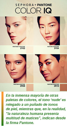 En la inmensa mayoría de otras paletas de colores, el tono nude es relegado a un puñado de tonos de piel, mientras que, en la realidad, "la naturaleza humana presenta multitud de matices", indican desde la firma Pantone, que ya se había asociado con Sephora en 2012 para una gama de maquillaje distribuida en los Estados Unidos.