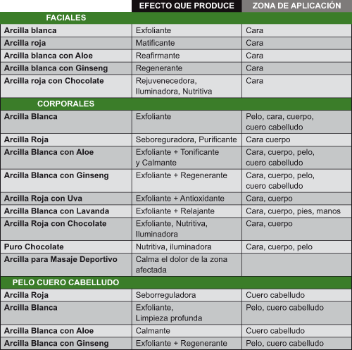 Con la base de estas arcillas se ha completado una línea de producto que se consigue mezclando éstas con otros ingredientes, como aloe, ginseng, lavanda, chocolate... que añaden a estos beneficios los propios de cada ingrediente.