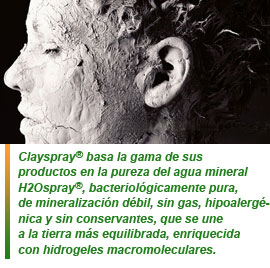 Clayspray® basa la gama de sus productos en la pureza del agua mineral H2Ospray®, bacteriológicamente pura, de mineralización débil, sin gas, hipoalergénica y sin conservantes, que se une a la tierra más equilibrada, enriquecida con hidrogeles macromoleculares.
