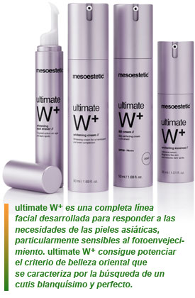 ultimate W+ es una completa línea facial desarrollada para responder a las necesidades de las pieles asiáticas, particularmente sensibles al fotoenvejecimiento. ultimate W+ consigue potenciar el criterio de belleza oriental que se caracteriza por la búsqueda de un cutis blanquísimo y perfecto.