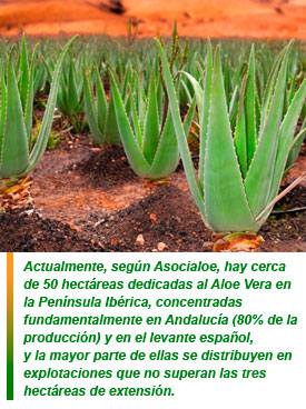 Actualmente, según Asocialoe, hay cerca de 50 hectáreas dedicadas al Aloe Vera en la península ibérica, concentradas fundamentalmente en Andalucía (80 por ciento de la producción) y en el levante español, y la mayor parte de ellas se distribuyen en explotaciones que no superan las tres hectáreas de extensión.