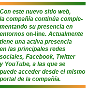 Con este nuevo sitio web, la compañía continúa complementando su presencia en entornos on-line. Actualmente tiene una activa presencia en las principales redes sociales, Facebook, Twitter y YouTube, a las que se puede acceder desde el mismo portal de la compañía. De esta forma, la multinacional consigue una presencia cada vez más próxima a sus usuarios y clientes.