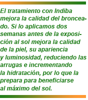 El tratamiento con Indiba® mejora la calidad del bronceado. Si lo aplicamos dos semanas antes de la exposición al sol mejora la calidad de la piel, su apariencia y luminosidad, reduciendo las arrugas e incrementando la hidratación, por lo que la prepara para beneficiarse al máximo del sol. Además activa el metabolismo, en el que juega un papel fundamental la síntesis de melanina, el pigmento responsable de su coloración.