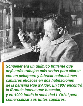 El sensato descubrimiento de Eugène Schueller para amasar una fortuna fue comprender que las mujeres, capaces de teñirse el pelo con tinturas peligrosas para la salud, necesitaban tintes que no fueran nocivos. Schueller era un químico brillante que dejó atrás trabajos más serios para aliarse con un peluquero y fabricar coloraciones capilares eficaces en dos habitaciones de la parisina Rue d'Alger. En 1907 encontró la fórmula inocua que buscaba, y en 1909 fundó la sociedad L'Oréal para comercializar sus tintes capilares. El nombre de la marca pudo inspirarse en un peinado de la época llamado l'auréole.