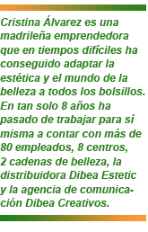 Cristina Álvarez es una madrileña emprendedora que en tiempos difíciles ha conseguido adaptar la estética y el mundo de la belleza a todos los bolsillos. En tan solo 8 años ha pasado de trabajar para sí misma a contar con más de 80 empleados, 8 centros, 2 cadenas de belleza, la distribuidora Dibea Estetic y la agencia de comunicación Dibea Creativos.