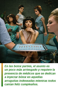 En la misma línea y mucho más extendidas se encuentran las botox parties. Aunque aquí también se trata de que los invitados -ellas sobre todo- se sientan como nuevos, el asunto es un poco más arriesgado y requiere la presencia de médicos que se dedican a inyectar bótox en aquellas arruguitas indeseadas mientras todos cantan feliz cumpleaños. El bótox no es más que la tan temida toxina botulínica, la misma que puede intoxicarnos si se la consume pero que también tiene su lado positivo: inmoviliza y relaja los músculos que, al gesticular, causan las líneas en la piel y evita que se noten las arrugas. Alérgicos a las agujas, abstenerse.