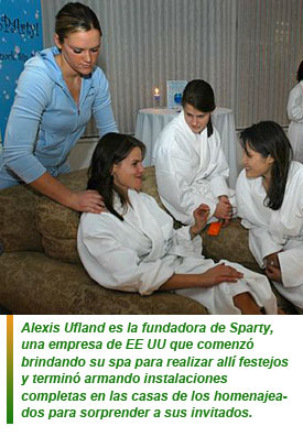 La más costosa de todas estas nuevas fiestas es, sin duda, la spa party, que por una media de 20.000 dólares ofrece una variadísima gama de servicios de relax y salud para que la ansiada fiesta sea inolvidable. La pionera fue Alexis Ufland, fundadora de Sparty, una empresa de EE UU que comenzó brindando su spa para realizar allí festejos y terminó armando instalaciones completas en las casas de los homenajeados para sorprender a sus invitados.