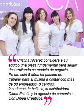 cristina alvarez Cristina Álvarez es una madrileña emprendedora que en tiempos difíciles ha conseguido adaptar la estética y el mundo de la belleza a todos los bolsillos. En tan solo 8 años ha pasado de trabajar para sí misma a contar con más de 80 empleados, 8 centros, 2 cadenas de belleza, la distribuidora Dibea Estetic y la agencia de comunicación Dibea Creativos.