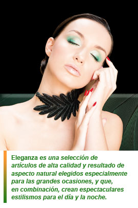 Eleganza es una selección de artículos de alta calidad y resultado de aspecto natural elegidos especialmente para las grandes ocasiones, y que, en combinación, crean espectaculares estilismos para el día y la noche. Una serie de artículos como el Fluido Antiarrugas, Jade&Emerald de la gama de sombras de ojos Eternity Shadow, el Lip Gloss Star, la laca de uñas Rojo London, y la Máscara 3D volumeXpression, pensados especialmente para las grandes ocasiones.