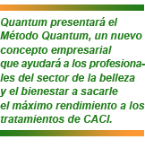En este evento, sólo para profesionales del sector, se mostrará la eficacia de sus resultados y se presentará el Método Quantum, un nuevo concepto empresarial que ayudará a los profesionales del sector de la belleza y el bienestar a sacarle el máximo rendimiento a los tratamientos de CACI.