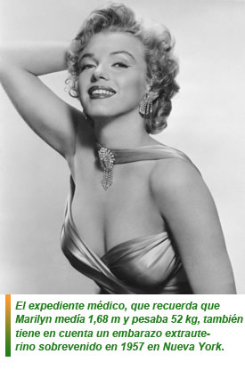 El expediente médico, que recuerda que Marilyn medía 1,68 m y pesaba 52 kg, también tiene en cuenta un embarazo extrauterino sobrevenido en 1957 en Nueva York.