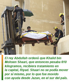 En agosto pasado, el rey Abdullah ordenó que Khalid bin Mohsen Shaari, que entonces pesaba 610 kilogramos, recibiera tratamiento en la capital, Riyad. Shaari no se podía mover por sí mismo, por lo que fue movido con ayuda desde Jazan, en el sur del país.