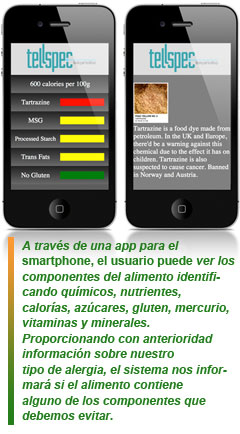 TellSpec es un pequeño espectrómetro que puede recopilar información sobre la comida, la envía a un servidor que interpreta estos datos y el usuario puede, a través de una app para su smartphone, ver los componentes del alimento identificando químicos, nutrientes, calorías, azúcares, gluten, mercurio, vitaminas y minerales.