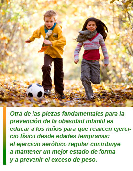 Otra de las piezas fundamentales para la prevención de la obesidad infantil es educar a los niños para que realicen ejercicio físico desde edades tempranas: el ejercicio aeróbico regular contribuye a mantener un mejor estado de forma y a prevenir el exceso de peso. Igualmente hay que estimular los juegos al aire libre y limitar el tiempo dedicado a actividades pasivas como ver la televisión o jugar con consolas u ordenadores.
