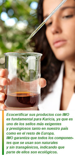 Ecocertificar sus productos con IMO es fundamental para Karicia, ya que es uno de los sellos más exigentes y prestigiosos tanto en nuestro país como en el resto de Europa. IMO garantiza que todos los componentes que se usan son naturales y sin transgénicos, indicando que parte de ellos son ecológicos. En sus controles inspecciona todas las instalaciones asegurando que la producción sea ecológica y siga unas normas de sostenibilidad.