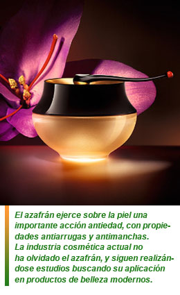 Esto significa que el azafrán ejerce sobre la piel una importante acción antiedad, con propiedades antiarrugas y antimanchas, razón por la cual Yves Saint Laurent ha decidido sacar una nueva línea de productos antienvejecimiento cuya base es el azafrán. Gran parte de esta acción se debe al crocín, elemento de la especia responsable de dar el tono dorado a la comida, cuyas propiedades antioxidantes mejoran el funcionamiento de las células, disminuyen la inflamación y controlan las enzimas responsables de la aparición de las manchas en la piel.