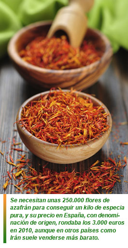 La dificultad y artesanía de su cultivo y recolección hacen tenga un elevado precio, de ahí el sobrenombre de "oro rojo", y de él se ha dicho que vale más que el oro y las joyas. Se necesitan unas 250.000 flores de azafrán para conseguir un kilo de especia pura, y su precio en España, con denominación de origen, rondaba los 3.000 euros en 2010, aunque en otros países como Irán suele venderse más barato.