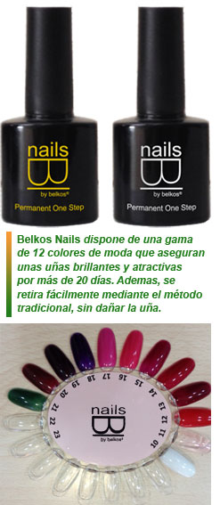 Belkos Nails dispone de una gama de 12 colores de moda que aseguran unas uñas brillantes y atractivas por más de 20 días. Ademas, se retira fácilmente mediante el método tradicional, sin dañar la uña.